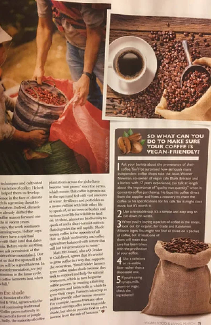 Bird & Wild recently featured in an article on the subject of vegan coffee in Vegan Food & Living Magazine: